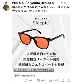 こんばんは Xで表示された広告に『入眠のためのメガネ』なるものが 寝る直前までスマホをさわっちゃうので 気になるなぁ。というよりも存在を 知らなかった。世の中技術は発展しているのですね。 JINSにもあった