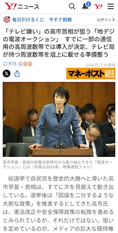 衆院選から 10日も経っていない中 次から次へと 新しい政策案が 高市政権から打ち出されている "電波オークション" 初めて聞く響きだけど 一瞬で悪寒がした 電波を一般に売りさばくって事は 市場原理で 弱いところが バタバタと淘汰される メディアは公平性を担保する観点から マイノリティを守る役割も担うはずが 資金がある、権力がある そういうところが 好きに放送できるようになってしまう 「情報を制するものは戦いを制す」 まさにそうなろうとしている これはかなりゆゆしき問題だよ 自民党圧勝した中では どんな法案も ほいほい通っていきそう 声も届かない どんどん生き辛い世の中になっていくなあ