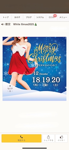 本日から3日間 クリスマス🎄イベントだょ ギリギリ星人💫 現在の状況… ご想像にお任せします 今日も元気で在てね ♡ ♡ ♡ ♡ ♡ ♡ ♡ ♡ ♡ ♡ ♡ キャストさんの出勤に関しまして お問い合わせいただいた上 ご来店いただけますと すれ違いがナィかと存じます 何卒よろしくお願い申し上げます 皆さまのご来店、心よりお待ちしております ♡ ♡ ♡ ♡ ♡ ♡ ♡ ♡ ♡ 離宮 HP https://sp.pokepara.jp/aichi/m201/a201/shop7093/ 女の子情報 https://sp.pokepara.jp/aichi/m201/a201/shop7093/gal/ 離宮情報 ♡地下鉄東山線・名城線「栄駅」1番出口より徒歩3分 ♡地下鉄桜通線・名城線「久屋大通駅」4番出口より徒歩3分 ドリンクメニュー https://sp.pokepara.jp/aichi/m201/a201/shop7093/drink.html フードメニュー https://sp.pokepara.jp/aichi/m201/a201/shop7093/food.html ♡ ♡ ♡ ♡ ♡ ♡ ♡ ♡ ♡ ♡ ♡ CAFE 系列店 情報 名古屋 中村区Club NIGHT CAFE https://sp.pokepara.jp/aichi/m201/a202/shop6072/ 知立NIGHT CAFE https://sp.pokepara.jp/aichi/m206/a227/shop6632/ 今池SNACK L I LY https://sp.pokepara.jp/aichi/m201/a205/shop14271/ 錦Mrs.CAFE 光 https://sp.pokepara.jp/aichi/m201/a201/shop15158/ 錦離 https://sp.pokepara.jp/aichi/m201/a201/shop17504/