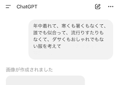 なんかさ、急に寒いやん? んで、服装って季節感ムズいやん? これは夏っぽいとか、これは色的に季節外れとか、冬の生地やーとか あと、流行りがどうとか 組み合わせがどうとか 似合うとか似合わんとか だからさ‼️ 年中着れて、寒くも暑くもなくて、誰でも似合って、流行りすたりもなくて、ダサくもおしゃれでもない服を考えてもらお‼️ 出来ました‼️ だっさ😉 「年中着れて」を季節の野菜貼り付けときゃいいわっていう浅はかな考えが… 好きっっ♥️ 〜完〜