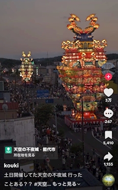 移動中見ていた動画の風景が綺麗すぎて一瞬AIかと思っちゃいました。秋田県能代市の『天空の不夜城』という大型城郭灯籠を曳くお祭りのようです。綺麗すぎる 2013年に約一世紀ぶりの復活。明治時代の銀板写真一枚をもとに再現されたというのもすごいですよね。こんなに華やかなイベントがあるとは知りませんでした。素晴らしい。